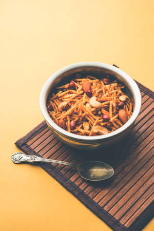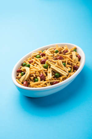 Indian Snacks: Traditional Indian deep fried salty dish called chivda or mixture or farsan made of gram flour and mixed with dry fruits and roasted nuts with salt, pepper, pulses, spice and green peas