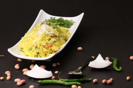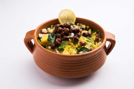 Power Kabuli Chana Poha or Protein Rich Choley Pohe, Popular Maharashtrian, Indian breakfast recipe, selective focus