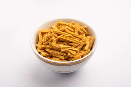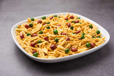 stock photo of Sev Namkeen Food Collection Aloo Sev also know as namkin and nimco a popular crisp savory snack made from mashed potatoes, chickpea flour and spices