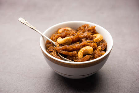 Galar Halwa with Vanilla Ice cream, served in a bowl and garnished with dry fruits. selective focus