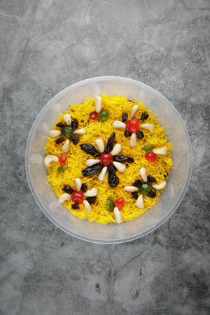 Kashmiri sweet modur pulao made of rice cooked with sugar, water flavored with Saffron and dry fruits