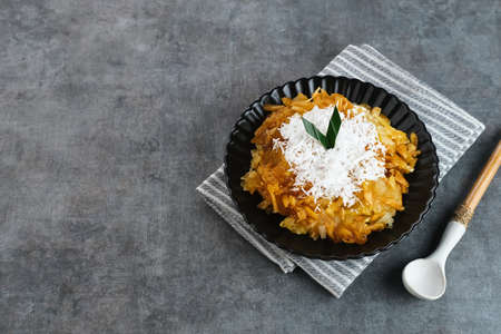 Sawut or Gobet Singkong, Indonesian traditional snack made from steamed shredded cassava, and palm sugar, served with grated coconut