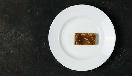 White plate with a piece of sweetness lukum on a dark background