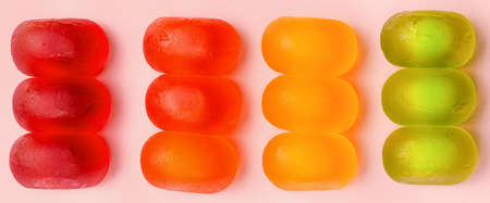Flat lay with colorful gummy sweets with sugar on pink surface, banner