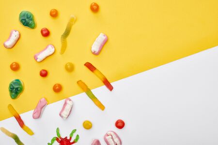 top view of colorful gummy sweets and bonbons on yellow and white background, Halloween treat