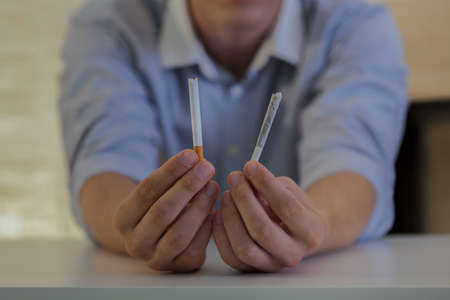 Smiling caucasian man breaking cigarette standing over grey copy space. Focus on hand destroy cigarette-butt. No smoking campaign, quitting smoking and healthy lifestyle concept