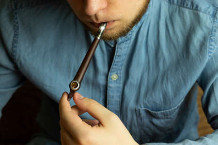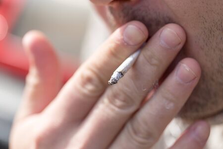 The young person smoking medical marijuana joint outdoors. The young man smoke cannabis blunt, close-up. Cannabis is a concept of herbal medicine.