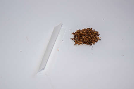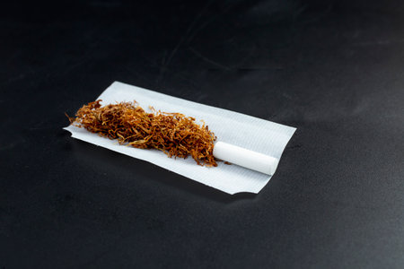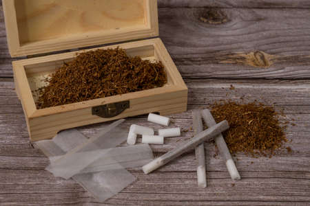 homemade cigarettes and tobacco, close-up with copy space. Cigarette production