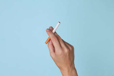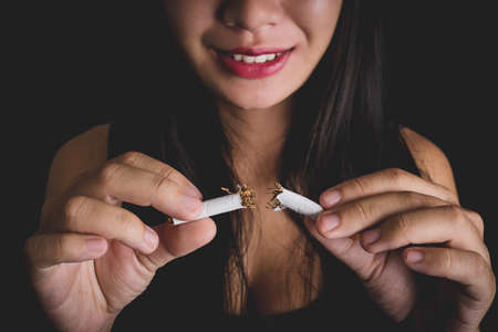 Crop woman breaking cigarette and quitting smoking. Closeup of crop woman splitting cigarette for idea of stop smoking.