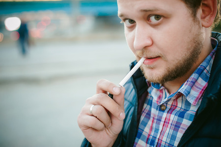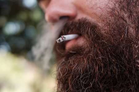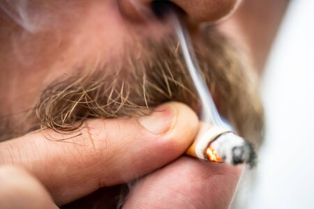 Adult bearded man in hoodie smoking cigarette, unhealthy habit, nicotine dependence closeup portrait, hand and lips detail