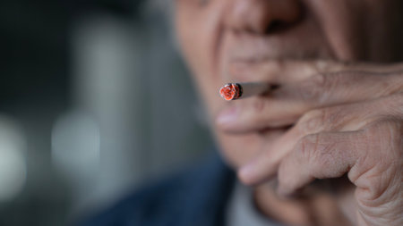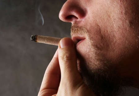 Man smoking a filter cigarette with a close up view of the burning cigarette between his fingers over a blurred blue tone background with copy space in a conceptual image