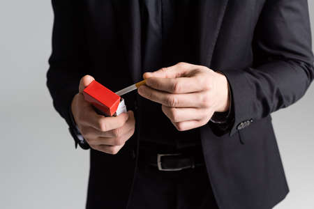 partial view of man in black formal wear holding cigarette pack isolated on grey