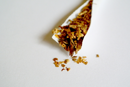Rolled cigarette and tobacco on a light gray background. Selective focus.