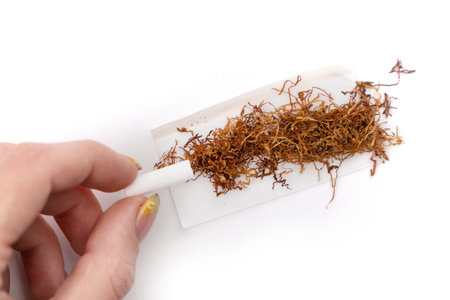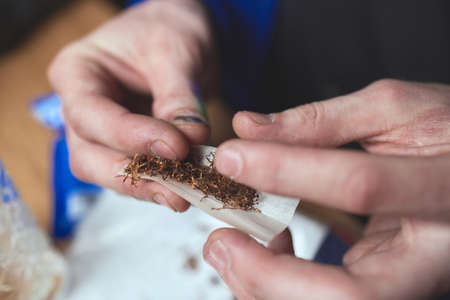 Female fingers of a practiced addicted young woman straighten up the brown fresh tobacco to spin a homemade cigarette