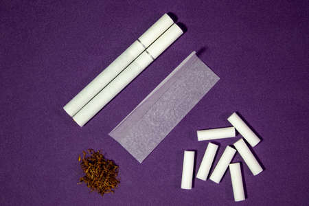 Pile of Dry Tobacco with Rolled Cigarettes and Filters on a Purple Background. Finely Cut Tobacco and Smoking Filters for Rolling Cigarettes. Concepts of Companies Producing Stgarettes.