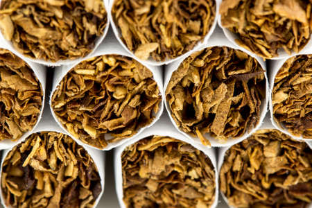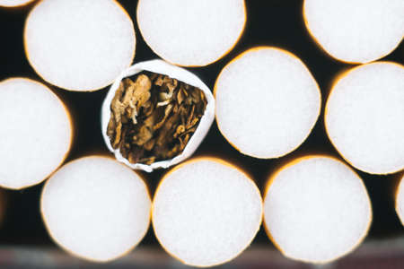 Close up tobacco cigarette background or texture. Heap of tobacco cigarettes close up from the front