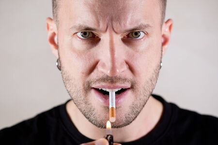 A man smokes cannabis weed, a joint and a lighter in his hands. Smoke on a black background. Concepts of medical marijuana use and legalization of the cannabis. On a black background