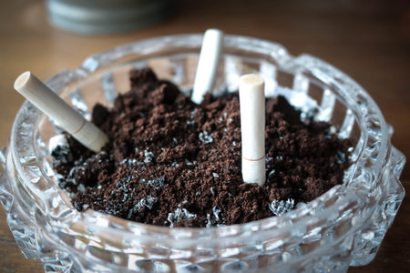 Close-up of cigarette butt extinguished in ashtray with smoke and ash. Concept of quit smoking. Nicotine addiction in smokers
