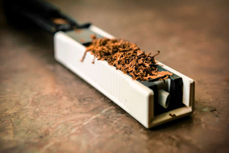 The machine for stuffing cigarettes with tobacco. Empty sighety. Rossypany tobacco on the table. Homemade cigarette production