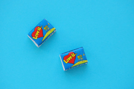 TERNOPIL, UKRAINE - JUNE 23, 2022: Love is - turkish bubble gums from 1990s popular in russian region. Various flavors of Love is chewing gum with liners about love in pile