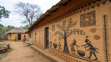 An Indian elder is teaching traditional dance to children in a village, adorned in cultural attire, amidst joyful learning in an outdoor setting