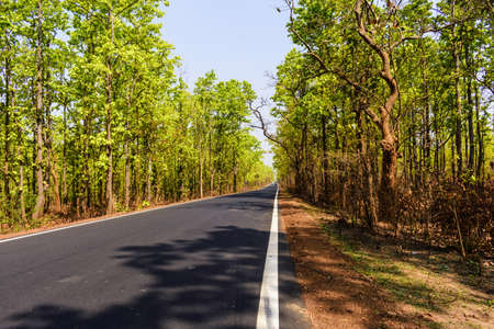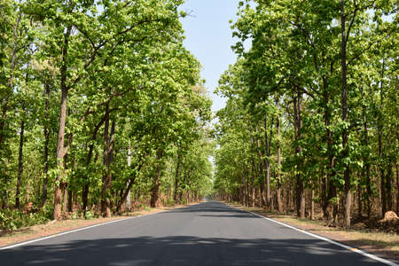 Indian Road going from the jungle plants and trees both side with no people during morning sunlight light rays.