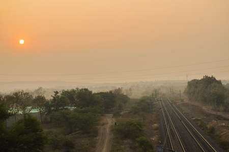 Stock photo- Spring pastel sunset on railroad track in a Indian rural scene