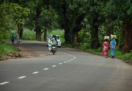 Kolhapur,Maharashtra,India-September 13th 2019;Stock photo of beautiful Indian village road, women walking and carrying bag on her head, motorbike and car moving forward on asphalt road .