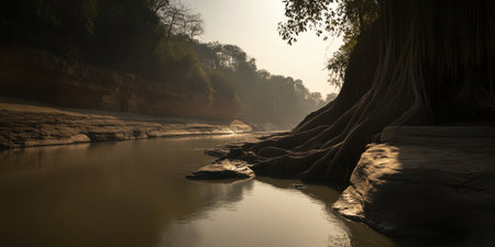 Serene River Landscape Majestic Tree Roots Ancient Rocks Tranquil Nature Scene Golden Hour Sunlight