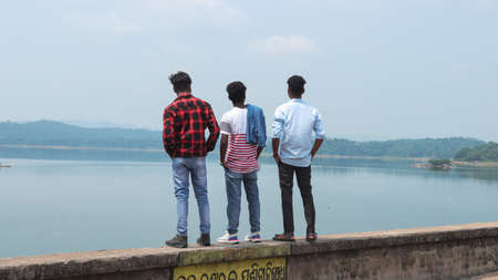 Rear view of three friends standing on the bridge and looking at the lake