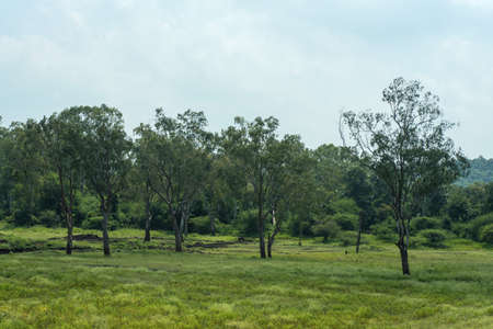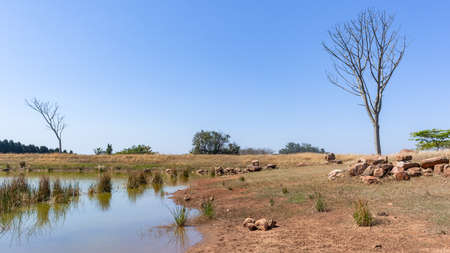 Meadow and waterhole looking towards the trees of Wayanad forest area, Kerala, India.