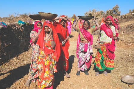 Jaisalmer, India - January 19, 2020 : Women colourful sari working on road