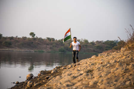 indian young man holding and waving indian flag, conceptual image for republic day or independence day, handsome man holding flag, man holding indian flag, indian flag waving