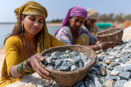 Indian women doing manual labor, working with gravel on a construction site
