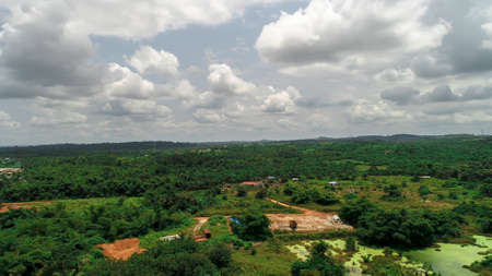 Aerial view of green rural fields under beautiful sky on Khagrachari Hill Tracts in Bangladesh.