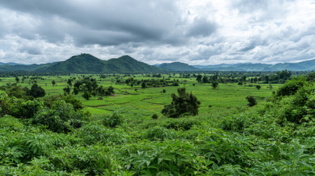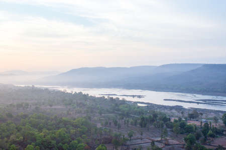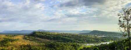 Landscape view of forest, mountain, and cloudy sky at border of Thailand and Lao