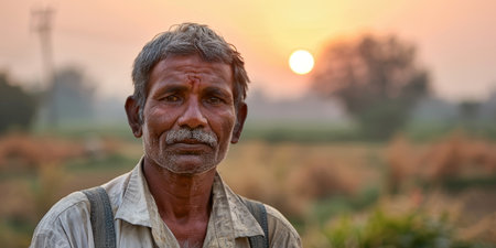 A man with a beard and mustache is standing in a field with a sunset in the background. The man is tired and is wiping sweat from his face