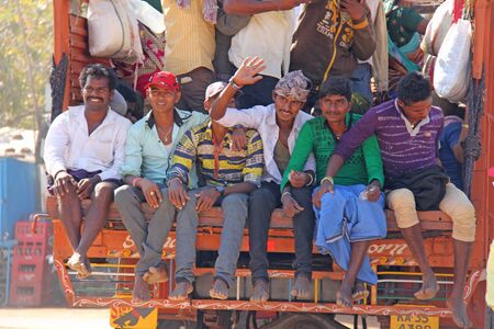 India, Hampi, 02 February 2018. A beautiful Indian truck carries a lot of Indian people. The merry Hindus smile and wave their hands.