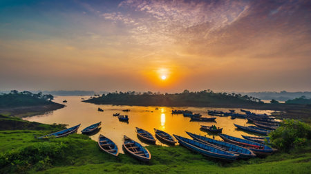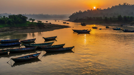 Fishing boats on the river at sunrise