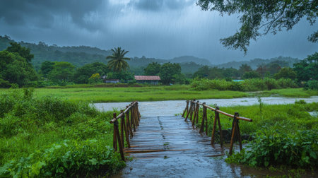 A peaceful bamboo bridge over a rain-soaked river, surrounded by lush green vegetation under heavy monsoon clouds.