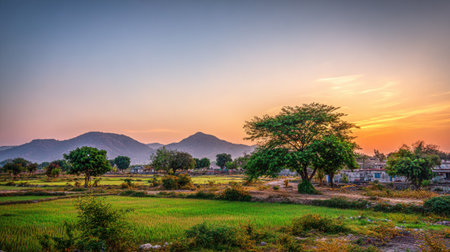 Scenic view captures a verdant, cultivated field in the foreground, leading towards scattered trees and a low line of rolling hills or mountains in the background, all bathed in the soft, warm glow of either sunrise or sunset. Small residential structures are visible clustered near the trees on the right side.