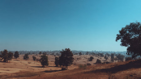 This image captures a tranquil savannah landscape featuring sparse trees under a clear blue sky. The vastness of the dry terrain evokes a serene and peaceful atmosphere.