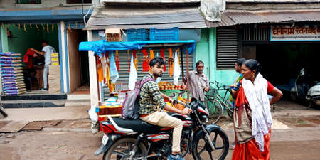 DISTRICT KATNI, INDIA - AUGUST 12, 2019: Indian brother wondering at market from bike for buying beautiful rakhi during hindu traditional festival called Rakshabandhan at asian street main market.