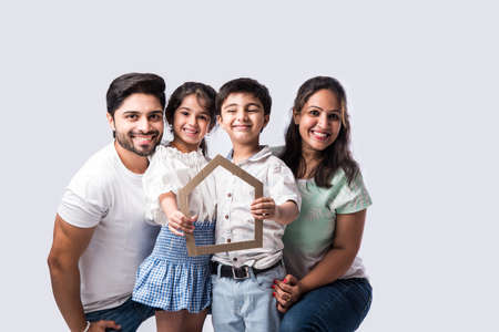 Indian family Father, mother, son and daughter holding 3D paper model of home - Real Istate Concept in India