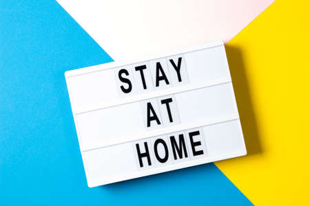 Lightbox with text STAY AT HOME on yellow, pink and light blue background. Top view