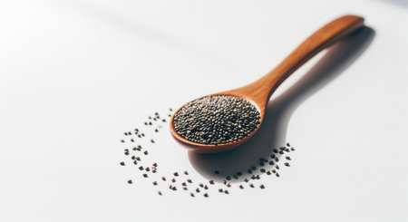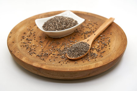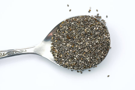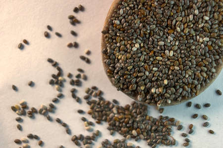 A heap of organic chia seeds on a wooden spoon rich in omega-3 fatty acids, side view on white background