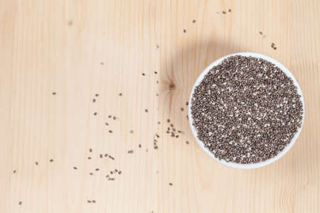 Organic Chia seeds rich in omega-3 and omega-6 fatty acids, vitamins, fiber, vegetable protein, amino acids, antioxidants and minerals, top view on white wooden background