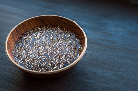 Chia seeds in water in a wooden bowl. concept of a healthy lifestyle