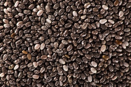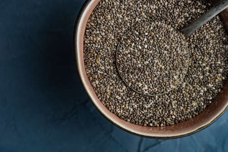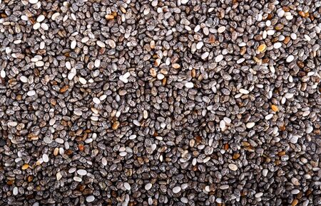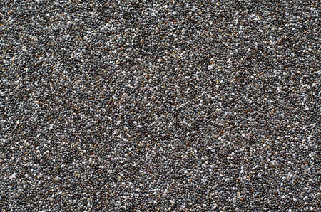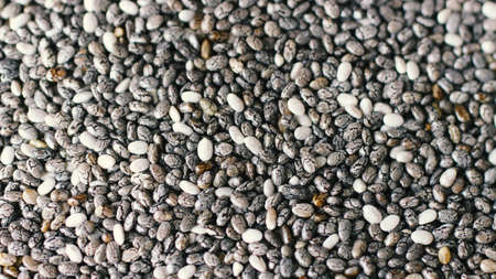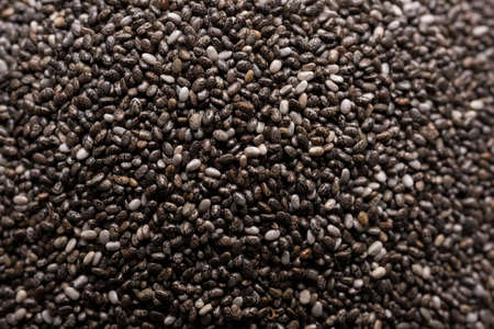 Chia seeds close-up background macro. The texture of the Chia seeds. Copy space. Flat lay. Healthy food from Chia seeds.