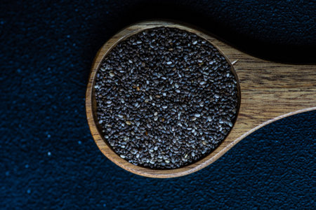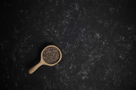 Spices. Chia seeds in a wooden spoon on a black and gray background. Top view.